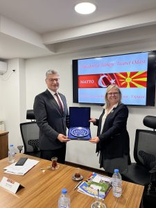 Görüşme sonrası, Nurcan Babalık tarafından Kuzey Makedonya Ekonomi Odası Yetkilisi Irena Mojsovska’ya ve Yönetim ve Endüstriyel Araştırma Kurumu Direktörü Gabriela Bogoeska’ya hediye takdiminde bulundu. Toplantıların ardından, kadın ve engellilerin el sanatlarına yönelik çalışmalarını destekleyen ve ürünlerinin satışını yapan bir sosyal girişim olan “Esnaf” adlı işletme ziyaret edildi.